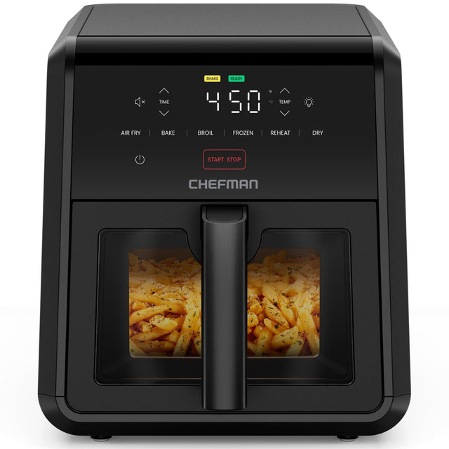 Enjoy your favorite deep-fried meals without the guilt or added calories with the Chefman TurboFry 7-Quart Air Fryer! Featuring a powerful DC motor, this air fryer uses incredible convection power to cook up to 40% faster than other conventional Chefman air fryers, so you can get dinner on the table faster than ever! With six cooking functions that reach up to 450°F, you can bake, air fry, broil, reheat, dehydrate, or cook foods from frozen with ease. The touch control panel makes programming your cooking as easy as possible, with intuitive options and a built-in digital timer. The 7-quart capacity is designed to be long and narrow, saving counterspace for any other important kitchen accessories. The nonstick basket features an easy-view window to monitor doneness without having to open the air fryer, and the matte-black finish looks stylish in any kitchen décor. Stop waiting forever to get dinner on the table and air fry faster. cETL approved with advanced safety technology for long-lasting durability and a 1-year assurance provided by Chefman. 1750W/120V