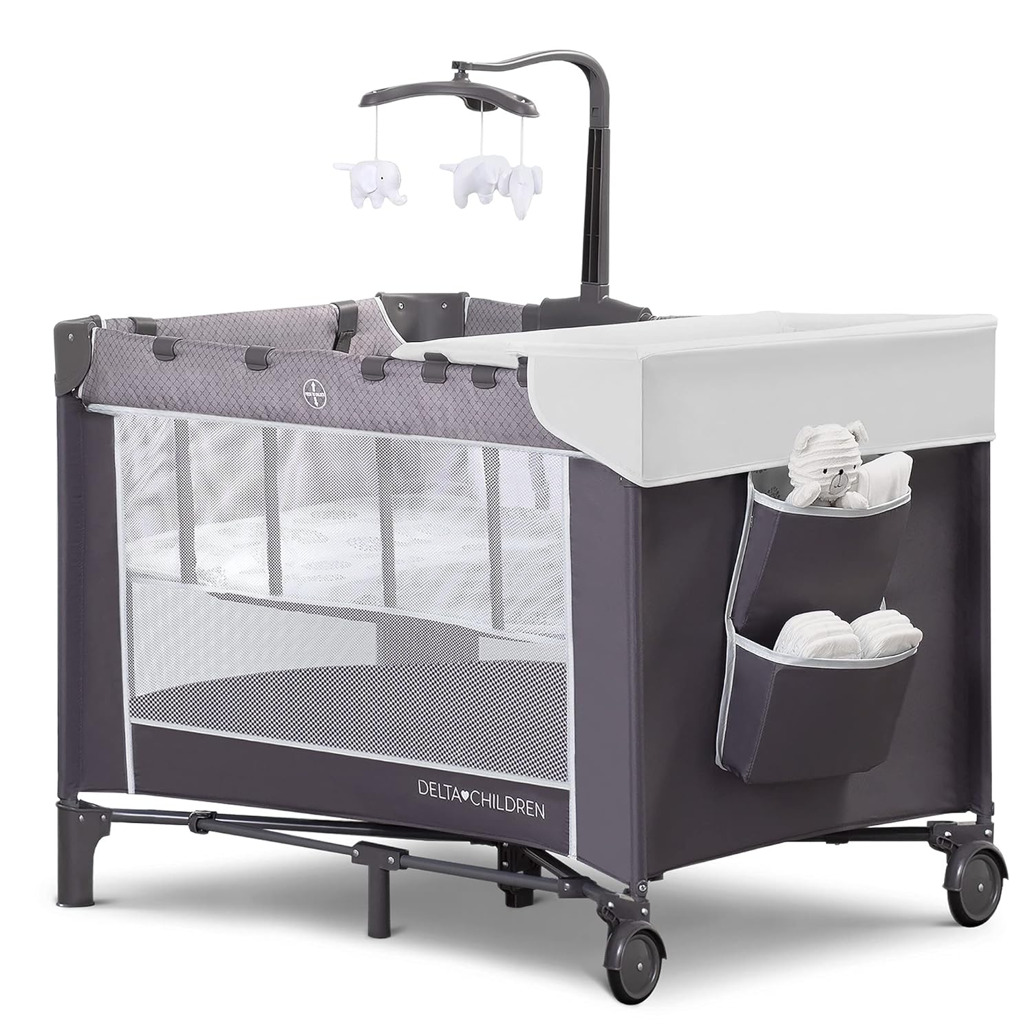 Keep your baby safe, close and comfy with the LX Deluxe Play Yard from Delta Children. You'll love all the convenient features-the removable bassinet provides the ideal spot for naptime or bedtime, and the removable changing table means you'll always have a sturdy place to change diapers or dress your baby. The detachable storage compartment keeps changing necessities nearby, so you never have to run to another room for diapers or wipes. When your baby outgrows the bassinet, the insert is removable and the LX Deluxe Play Yard functions like a full size playard. Large mesh sides provide optimal ventilation while also permitting a clear view. Designed to use at home or away, the play yard's wheels make it super-easy to move around the house, and the quick fold construction and included carry bag make for fuss-free travel. The LX Deluxe Play Yard from Delta Children features everything needed for a nursery in a portable design. Delta Children was founded around the idea of making safe, high-quality children's furniture affordable for all families. They know there's nothing more important than safety when it comes your child's space. That's why all Delta Children products are built with long-lasing materials to ensure they stand up to years of jumping and playing. Plus, they are rigorously tested to meet or exceed all industry safety standards.