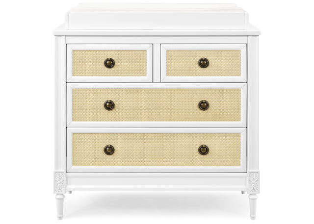 The Madeline 4 Drawer Dresser with Changing Top and Interlocking Drawers by Delta Children is an elegant and functional addition to the nursery, kids’ bedroom, even your master bedroom. The timelessness of this dresser is found in the details—the woven cane detailing on the drawer fronts, rosette carvings, fluted legs and antique brass drawer pulls elevate any bedroom. It features four spacious drawers for ample clothing storage and includes a removable changing top that creates the perfect space for diaper changing. Remove the changing top to create a more grown-up space later on. For your child’s safety, this dresser is outfitted with an interlocking drawer system that limits the number of drawers that can be opened at one time.