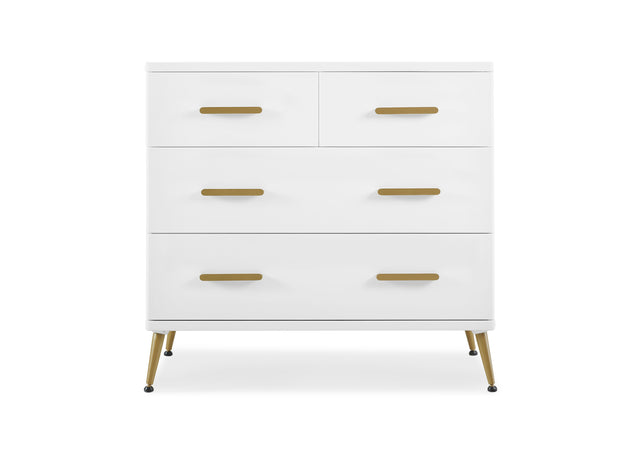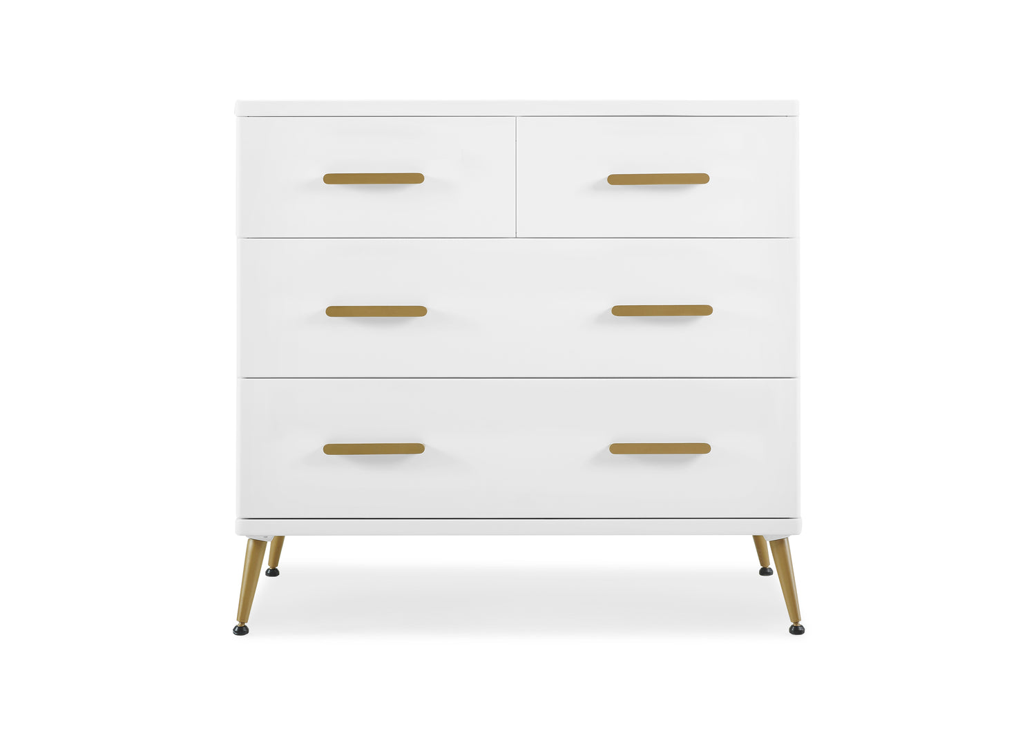 The Sloane 4 Drawer Dresser with Changing Top and Interlocking Drawers by Delta Children is the ultimate piece of kids’ furniture. Sleek and modern, it boasts a mixed material design with bronze splayed feet and drawer handles that make it elevated enough for your master bedroom. But this dresser is more than just fashionable—it's super functional, too. It features four spacious drawers for ample clothing storage and includes a removable changing top that creates the perfect space for diaper changing. Remove the changing top to create a more grown-up space later on.