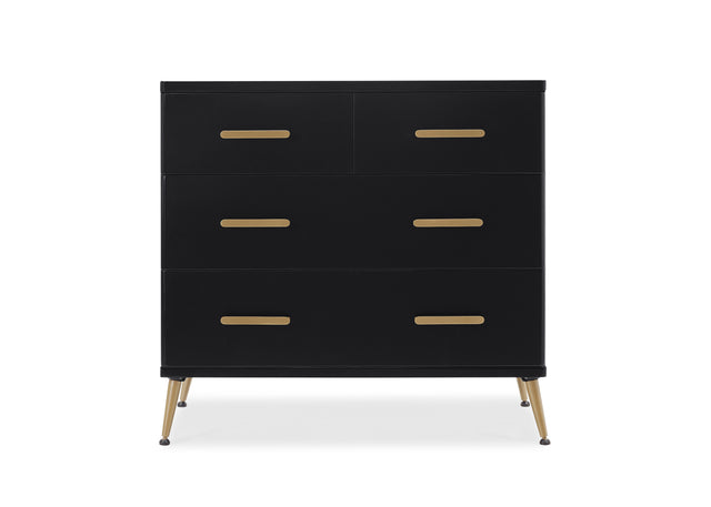 The Sloane 4 Drawer Dresser with Changing Top and Interlocking Drawers by Delta Children is the ultimate piece of kids’ furniture. Sleek and modern, it boasts a mixed material design with bronze splayed feet and drawer handles that make it elevated enough for your master bedroom. But this dresser is more than just fashionable—it's super functional, too. It features four spacious drawers for ample clothing storage and includes a removable changing top that creates the perfect space for diaper changing. Remove the changing top to create a more grown-up space later on.