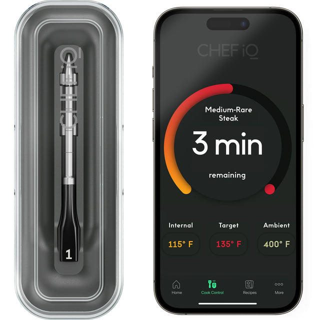 The ultra-thin CHEF iQ smart oven and grill thermometers use an advanced algorithm to calculate precise cooking times and temperatures for perfectly cooked meat. Receive real-time updates on your smart device via the CHEF iQ App, along with Smart Hub audio reminders to flip, baste, or remove from heat and an estimated time left to cook. Unlimited wireless range and long battery life offer ultimate convenience. High-heat safe and accurate to within 1 degree.