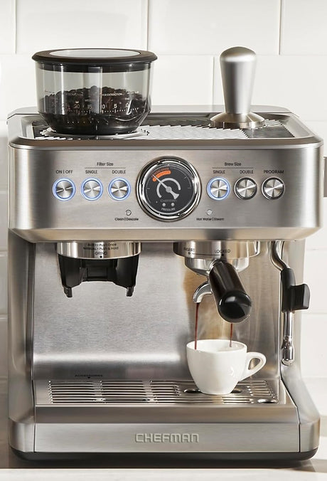 Chefman Crema Supreme Espresso Machine with Conical Burr Grinder and Steam Wand – Stainless Steel